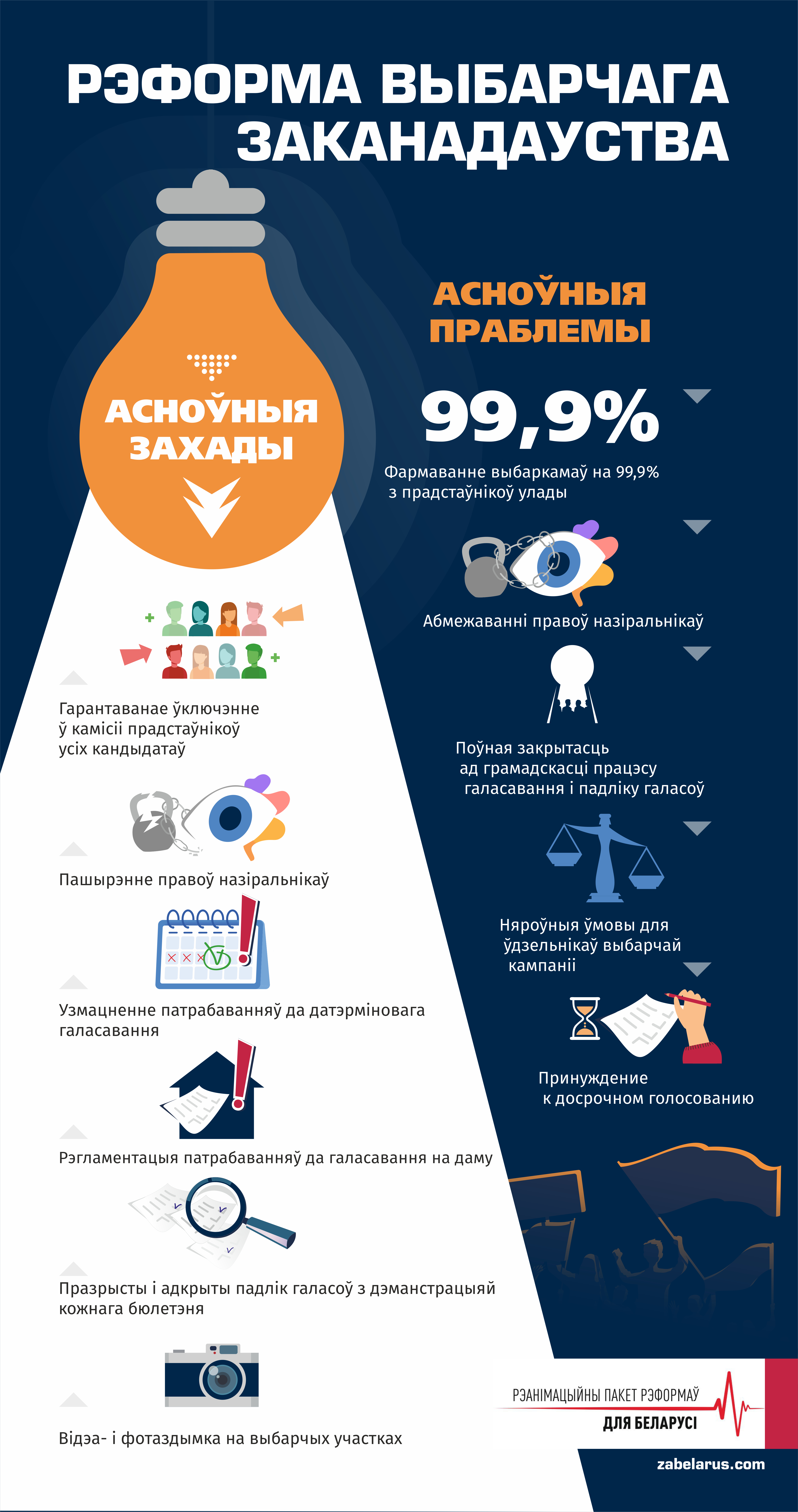 Только честные и свободные выборы могут дать импульс для выхода страны из хронического кризиса в экономике и социальной сфере. Представители политических партий и общественных объединений неоднократно предлагали изменения в избирательное законодательство, которые получали высокую оценку белорусских и международных экспертов. Однако все эти предложения натыкались на упорное нежелание действующей власти что-либо менять в избирательном процессе.